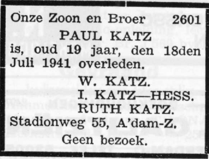 Die Familie Katz verließ 1934 Leipzig und zog nach Amsterdam, Niederlande. Paul besuchte das Vossius Gymnasium und absolvierte 1940 das Gymnasium, brach jedoch wegen des Krieges die medizinische Universität ab. Am 11. Juni 1941 wurde Paul bei einem Überfall festgenommen. Er landete in Kamp Schoorl, wo er am 23. Juni 1941 nach Mauthausen gebracht wurde. Hier starb er am 18. Juli 1941.