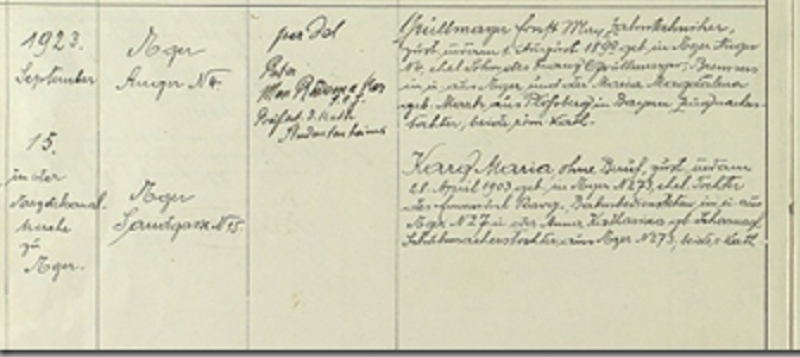 Ernst Max Grüllmayer wurde als Sohn von Franz Xaver Grüllmayer (geb. 4. Januar 1863) und Maria Magdalena Mark (geb. 10. Dezember 1862, gest. 21. April 1936) in Anger 4 in Eger geboren. Ernst Max Grüllmayer war römisch-katholischen Glaubens, arbeitete als Zahntechniker in Eger und heiratete am 15. September 1923 Maria Karg in Eger. Er wohnte in Eger 24. Warum er in das Konzentrationslager Mauthausen eingeliefert wurde, konnte ich noch nicht erforschen – er ist aber als Häftling dort bekannt unter dem Namen Grullmeyer - als Todesursache wurde „akuter Darmkatarrh, Herzschwäche“ angegeben.