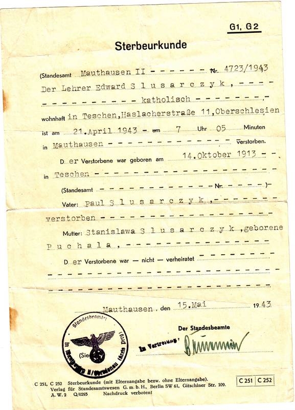 Geboren 14.10.1913 in Cieszyn Gestorben 21.4.1943 in Mauthausen