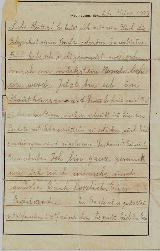 After a trial that took place on 3 October 1940, Edward was imprisoned in Graz. He was sentenced to imprisonment under harsh conditions (Halle [Saale], Zwickau). He was accused of joining the Polish army of exile under Sikorski and intending to join the fight against the German Reich. On 27 February 1943, at the end of his imprisonment, he was transferred to the Mauthausen concentration camp, where he was placed in Room B of Block 19 as a prisoner in the ‘preventive detention’ category. His prisoner number was 24175.