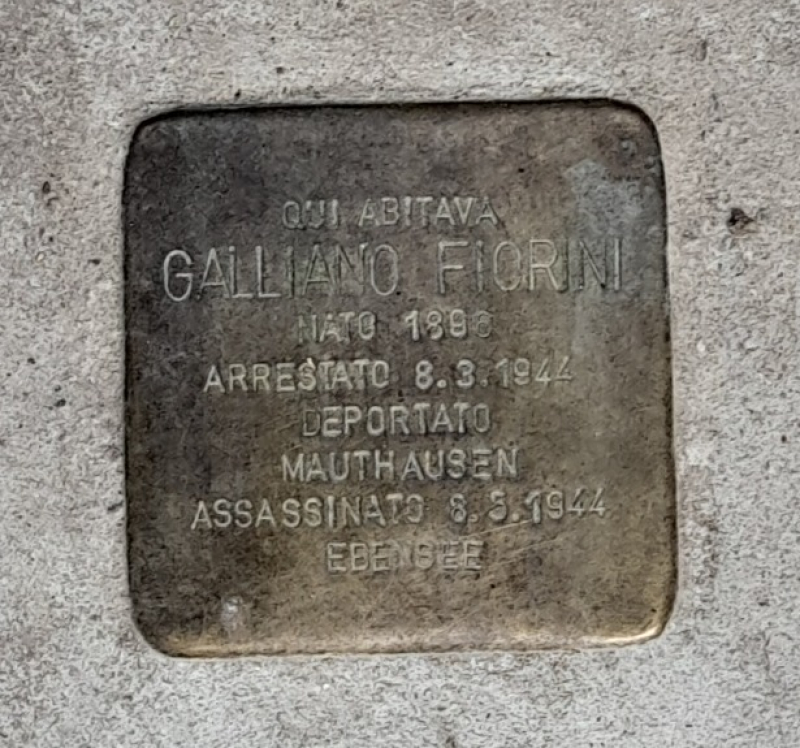 Galliano Fiorini wurde am 1. Februar 1896 in Montelupo Fiorentino geboren, wo er mit seinen beiden Kindern wohnte. Er war Witwer und arbeitete als Lagerarbeitet in der Glasfabrik CESA in Empoli (FI). Eines Tages wurde Galliano verhaftet. Man warf ihm vor, Flugblätter mit subversiver Propaganda bei sich gehabt zu haben und brachte ihn zuerst in das Gefängnis von Empoli und dann in das Gefängnis Le Murate von Florenz. Es vergingen 20 Tage, bis er freigesprochen wurde und man folterte ihn an den Händen mit Stecknadeln, in der Hoffnung, er würde ein paar Geheimnisse preisgeben. Galliano hat den Grund für seine Verhaftung nie zur Gänze verstanden, da er von den Flugblättern nichts wusste. Vielleicht hatte jemand absichtlich seinen Namen genannt, um sich für etwas zu rächen, das er unabsichtlich getan hatte. Am Morgen des 8. März 1944 kam seine Schwester Lida, die Ehefrau von Tommaso Caccialli, zu ihm. Sie hatte nach der Festnahme des Ehemanns Angst und kam auf der Suche nach Hilfe und Trost zu ihm. Galliano war sofort klar, dass er nicht viel tun konnte, um dem Schwager zu helfen. Er entschied dennoch, hinauszugehen, in der Hoffnung, dass ihm eine Idee kommen würde, was zu tun wäre. Plötzlich gingen drei Männer auf ihn zu: ein Repubblichino[1], ein Brigadiere und ein Carabiniere. Der erste wies die Carabinieri auf Galliano hin. Er wurde gezwungen, zusammen mit anderen, die in der derselben Nacht aufgegriffen worden waren, einen Lastkraftwagen zu besteigen. Zuerst wurde er in die Scuole Leopoldine nach Florenz gebracht, und dann musste er einen Zug am Bahnhof Santa Maria Novella besteigen, mit dem er am 11. März 1944 nach Mauthausen deportiert wurde, wo er mit der Häftlingsnummer 57122 registriert wurde. Daraufhin wurde er in das Konzentrationslager Ebensee überstellt, wo er am 8. Mai 1944 starb.