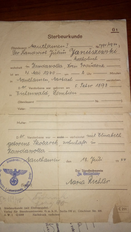 Juliusz Januszewski, mieszkał w Dębieniu /k. Nowego Miasta Lubawskiego, trudnił się rolnictwem. Po ślubie z żoną Elżbietą (31.01.1927r zamieszkał w Zawdzkiej Woli /k. Łasina. Tam też był sołtysem, ze względu na patriotyczne postawy i przeciwstawianie się niemcom był nękany i torturowany przez ,, folksdojczów'' w miejscowej kuźni. Został aresztowany przez Niemców i transportem wywieziony do Łasina, skąd pociągiem trafił do obozu. Posiadał wielodzietną rodzinę którą osierocił .
