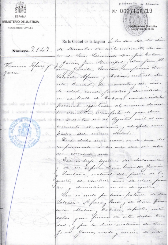 Francisco Javier Afonso García wurde am 8. Dezember 1902 in Valle Tabares in der Gemeinde San Cristóbal de La Laguna auf Teneriffa geboren. Er war Sohn von Salvador Afonso Melián aus La Orotava und Vicenta García Santana aus Tegueste; beide Orte befinden sich ebenfalls auf Teneriffa.