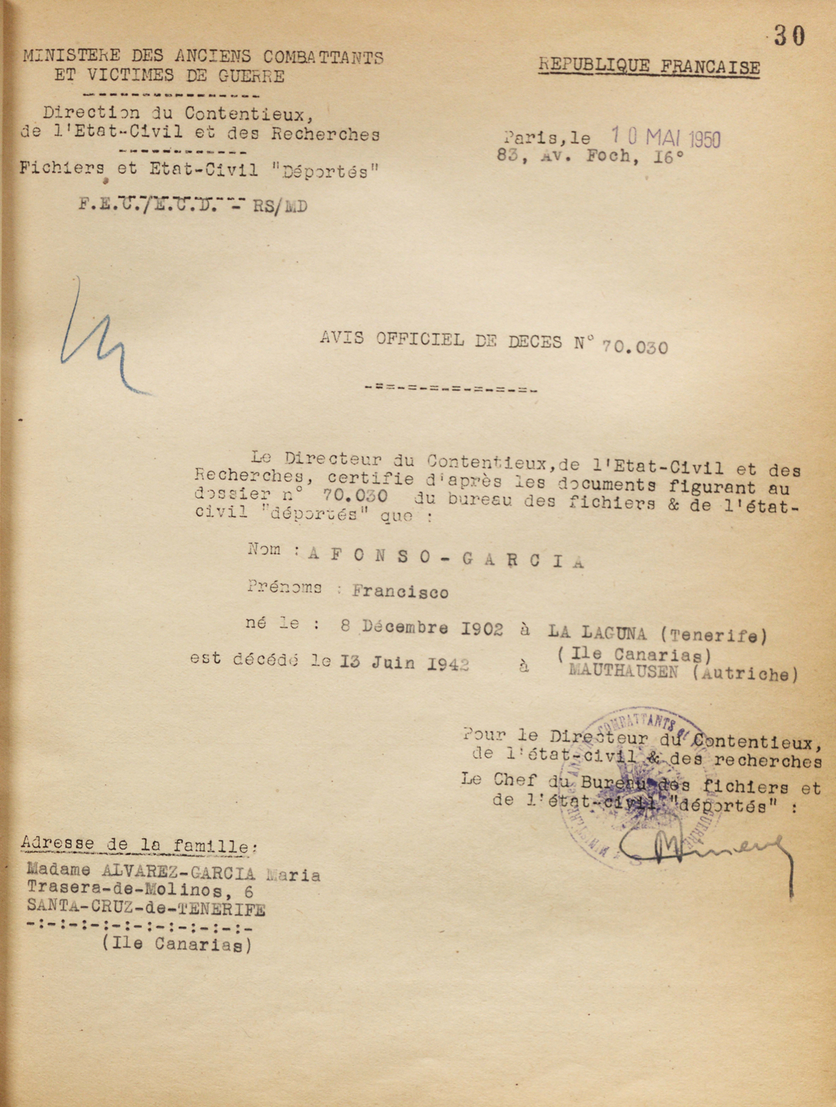 Nacido 8.12.1902 en Valle Tabares, San Cristóbal De La Laguna, Tenerife Muerto 13.6.1942 en Mauthausen
