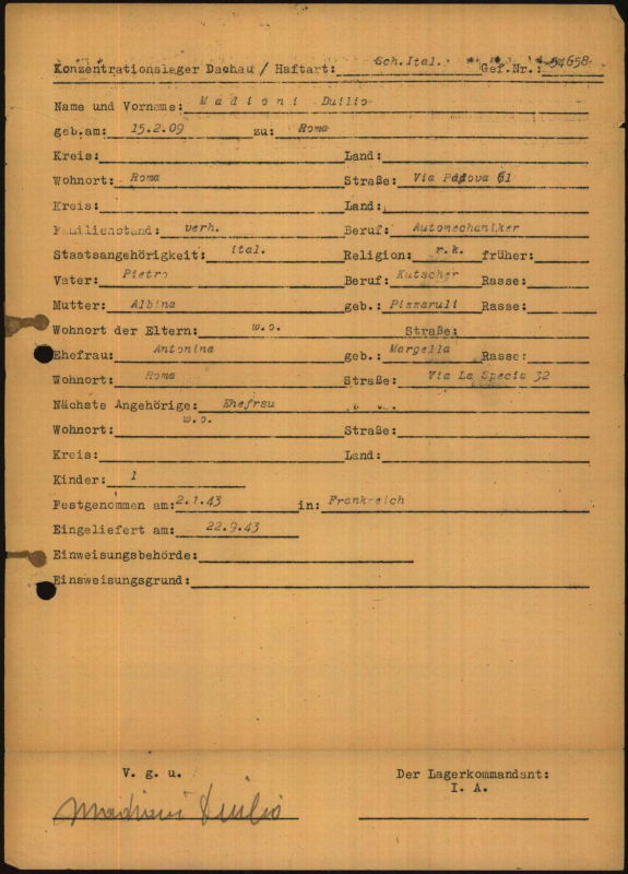 *) Giunge a Dachau il 22 settembre 1943, primo numero di matricola 54658 classificato con la categoria AZR. Mestiere dichiarato autista. Trasferito a Mauthausen tra il 2 ed il 6 dicembre 1943 dove ... Continuare a leggere
