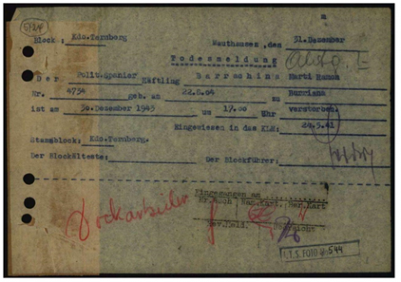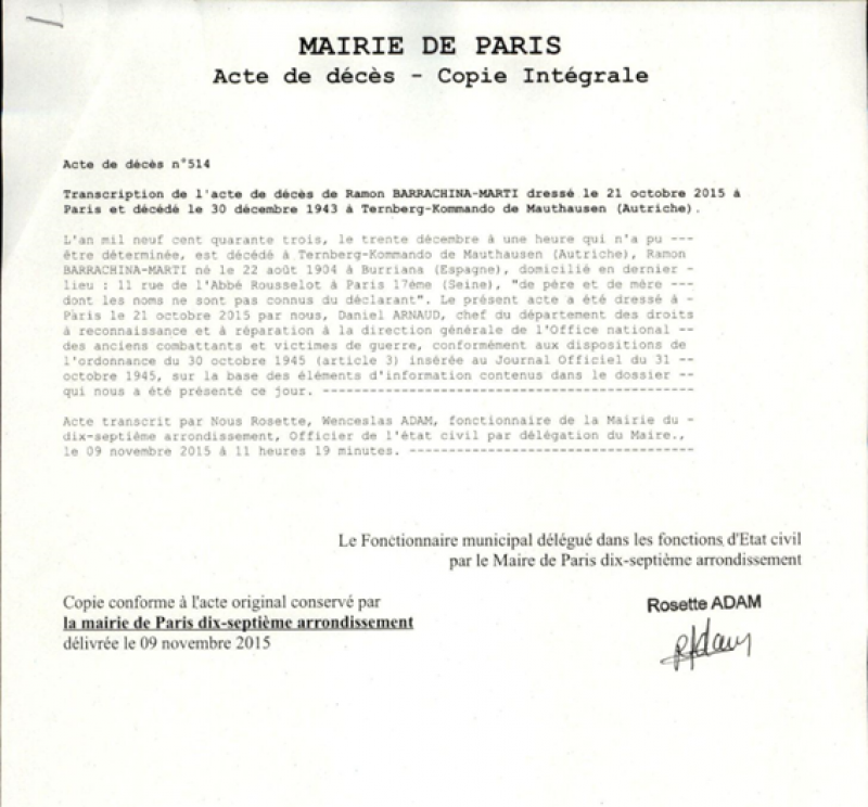 Por desgracia, uno de ellos fue Ramón, que falleció en Ternberg el 30 de diciembre de 1943 a las 5 de la tarde por insuficiencia cardíaca y pulmonía. Tenía 39 años. Su muerte no fue comunicada a ningún familiar y fue inscrita de oficio por el Ayuntamiento de París, ya que su último domicilio en suelo francés fue en la calle del Abbé Rousselot, número 11 de París 17ème (Siene).