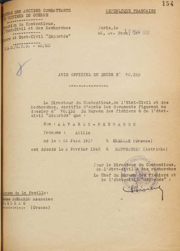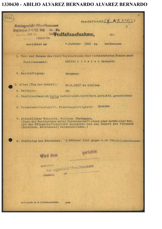 Abilio would survive for one year as a Rotspanier in the Mauthausen concentration camp where more than one hundred Galicians died. On 2 February 1942 his death was registered at Hartheim Castle, where he was gassed to death under the lethal 14f13 program.