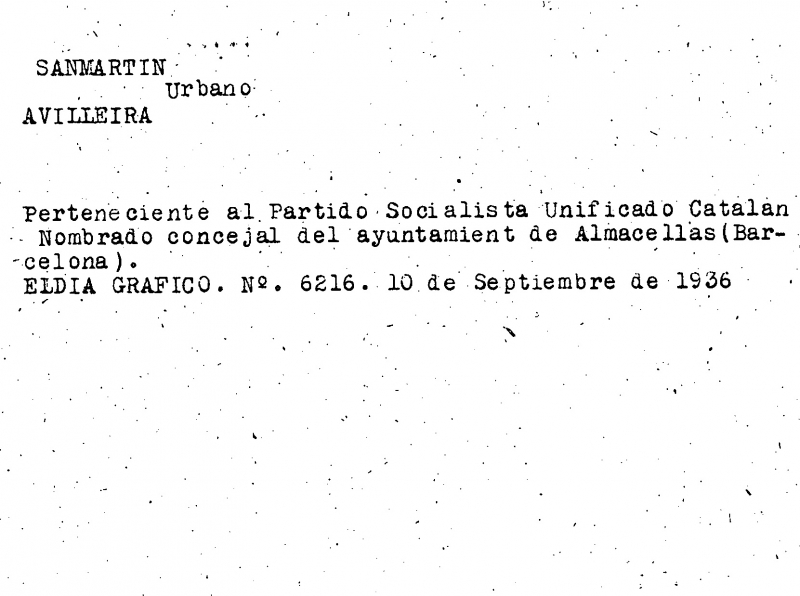 Urbano trabaja como jornalero y se afilia y a la U.G.T. en septiembre de 1936 y al P.S.U.C. en febrero de 1937. Durante la Guerra de España, es miembro del Comité Revolucionario de Almacelles. El periódico El Día Gráfico editado en Barcelona, con fecha 10 se septiembre de 1936, recoge la constitución del nuevo ayuntamiento de Almacelles y el nombramiento como concejal de Sanmartín Abilleira. En mayo de mayo de 1937 se le autoriza a poseer un arma de fuego.