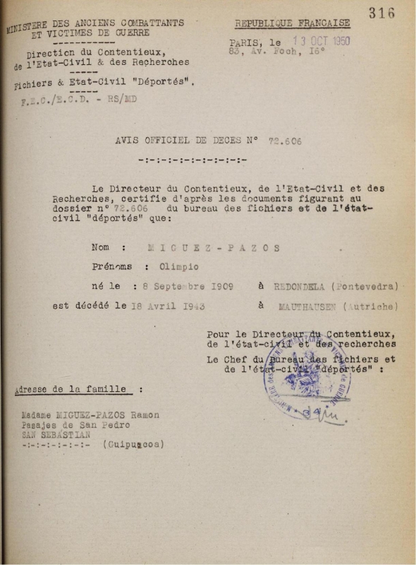 El aviso oficial de deceso de las autoridades francesas remitido en octubre de 1950, fue dirigido a la señora Míguez Pazos, esposa de su hermano Ramón, en Pasajes de San Pedro, San Sebastián.