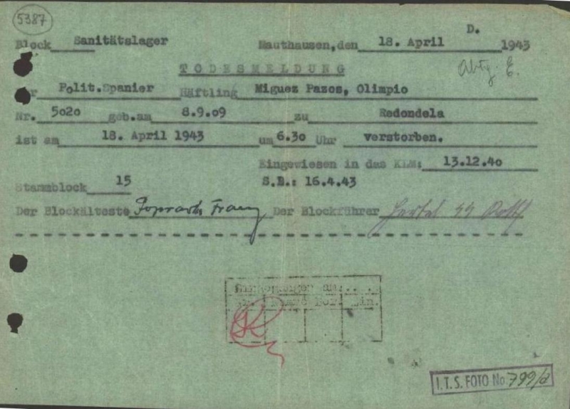 Consta su paso por la enfermería, donde perece a las 06:30 horas del 18 de abril de 1943. Es operado el 23 de noviembre de 1942 y el 5 de febrero de 1943. El diagnóstico es ilegible, aunque se desprende que tiene una herida en la axila.