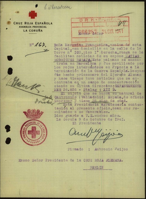 Ein Monat vor Matías’ Tod schrieb das Rote Kreuz A Coruña am 9. Oktober 1941 auf Antrag seiner Frau Mercedes den Vorsitz des Deutschen Roten Kreuzes in Berlin um Nachrichten an: „Besagter Landsmann hielt sich in Barcelona auf und wurde von den Roten mobilisiert, und ging nach Kriegsende nach Frankreich. Danach wurde er von der deutschen Wehrmacht gefangen genommen, und vor längerer Zeit wurde bekannt, dass er sich in einem Konzentrationslager aufhielt. Seine letzte Anschrift lautete: Gefangenennummer 36826 – Stalag XII-D. Die gesuchte Person ist aus Castronuño (Valladolid), 38 Jahre alt, von Beruf Schriftsetzer.“