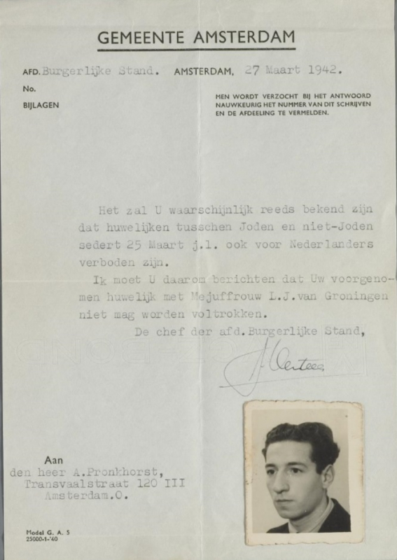 Abraham Pronkhorst, auch bekannt als Albert oder Ab, wurde am 18. September 1920 in Amsterdam geboren. Er war der Sohn von Samuel Pronkhorst (1982-1942) und Catharina Pronkhorst-Elsas (1893-1943). Abraham hatte zwei Brüder, einen jüngeren Bruder namens Joseph (1922-1942) und einen älteren Bruder namens Maurits, der das Elternhaus bereits verlassen hatte. Abraham war nicht nur beruflich als Lederarbeiter tätig, sondern auch an der Herstellung verschiedener Arten von Kunst beteiligt, darunter Gipsstatuen und Gemälde. Ungefähr zur Zeit des Ausbruchs des Zweiten Weltkriegs war Abraham mit Louise Johanna (Loes) van Groningen verlobt, einem nichtjüdischen Mädchen, das 1923 in Amsterdam geboren wurde. Als ihnen klar wurde, dass jüdische Männer verhaftet und in verschiedene Lager gebracht wurden innerhalb und außerhalb der Niederlande, beschlossen Abraham und Loes zu heiraten, in der Hoffnung, dass Abraham zu Hause bleiben könnte. Leider wurde ihr Plan zu heiraten abgelehnt, da Ehen zwischen Juden und Nichtjuden seit dem 25. März 1942 verboten waren. Bald darauf wurde Abraham verhaftet und ins Lager Amersfoort gebracht. Um den Mai 1942 schrieb Abraham mindestens zwei kurze Briefe aus dem Lager Amersfoort an seinen Vater, seine Mutter und seine Verlobte Loes.
